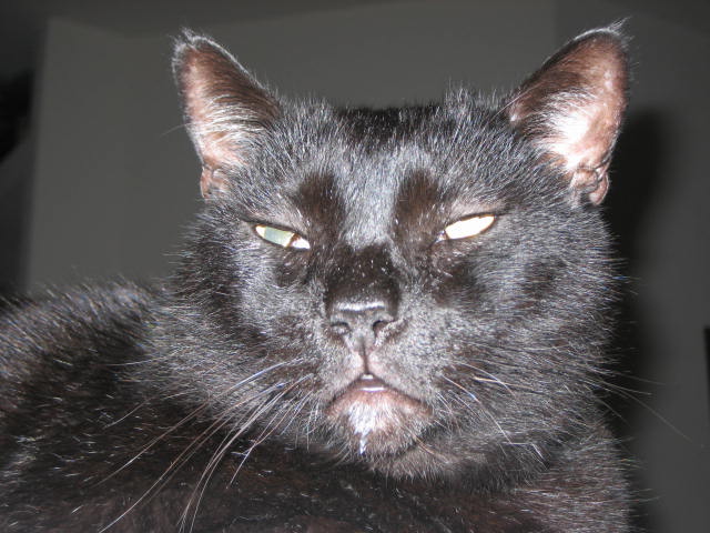 Blackie came to us in Tucson, Arizona about 4 years ago. Funny little (he’s actually pretty big!) guy he would chase our other kitty, Jennie, around the neighborhood crying for her like he was madly in love. He was a stray and got in a lot of fights with the other stray kitties. One day during a cold winter (imagine that in the desert, it even snowed that year!) he came to the patio door and let out the saddest cry of pain and help. I’ll never forget that cry or the expression on his face. He had a respiratory infection. So we slowly got him to come inside and eventually live with us. It took me a year and a half to get him to purr and almost a year before he trusted me enough to pick him up.